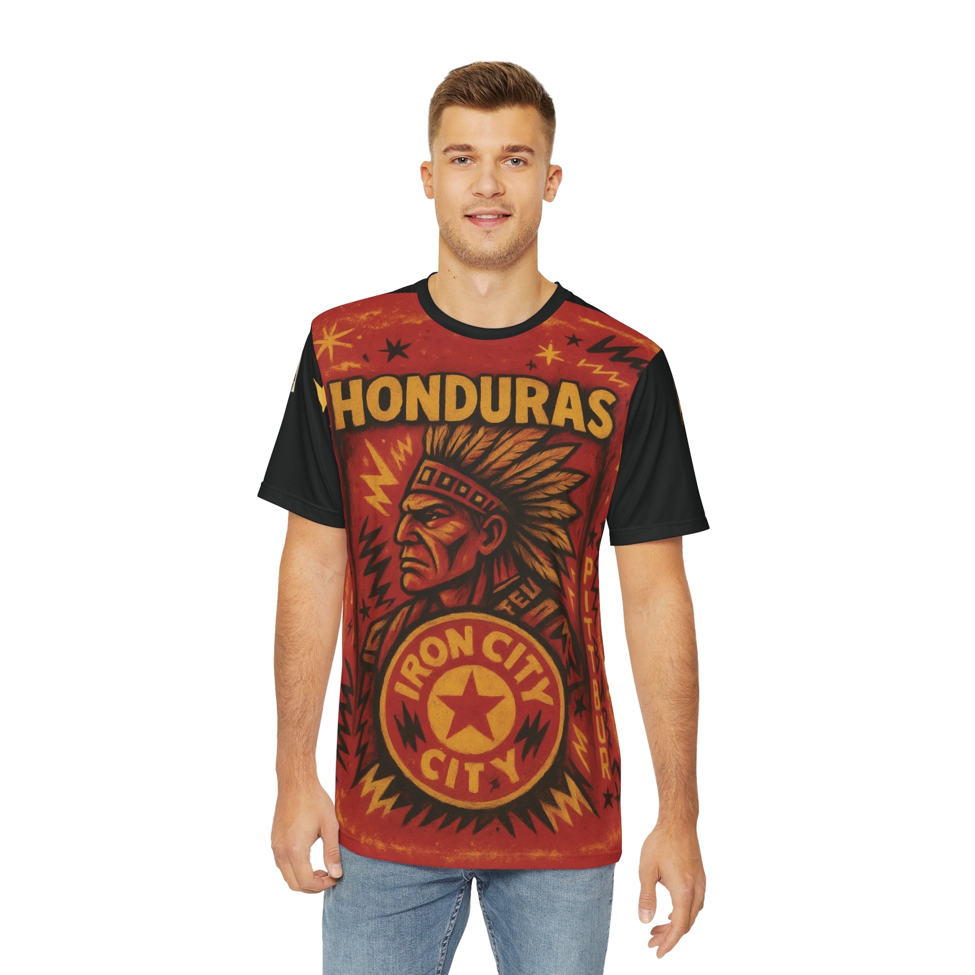 A tribute to heritage. This bold limited-run jersey fuses Honduran pride with the Iron City FC street-football spirit. Fronted by the commanding Steel Aztec Chief in Dark Red, Black, Gold and wrapped in tribal energy and gritty skyline vibes, this piece is a cross-cultural statement of strength and unity.