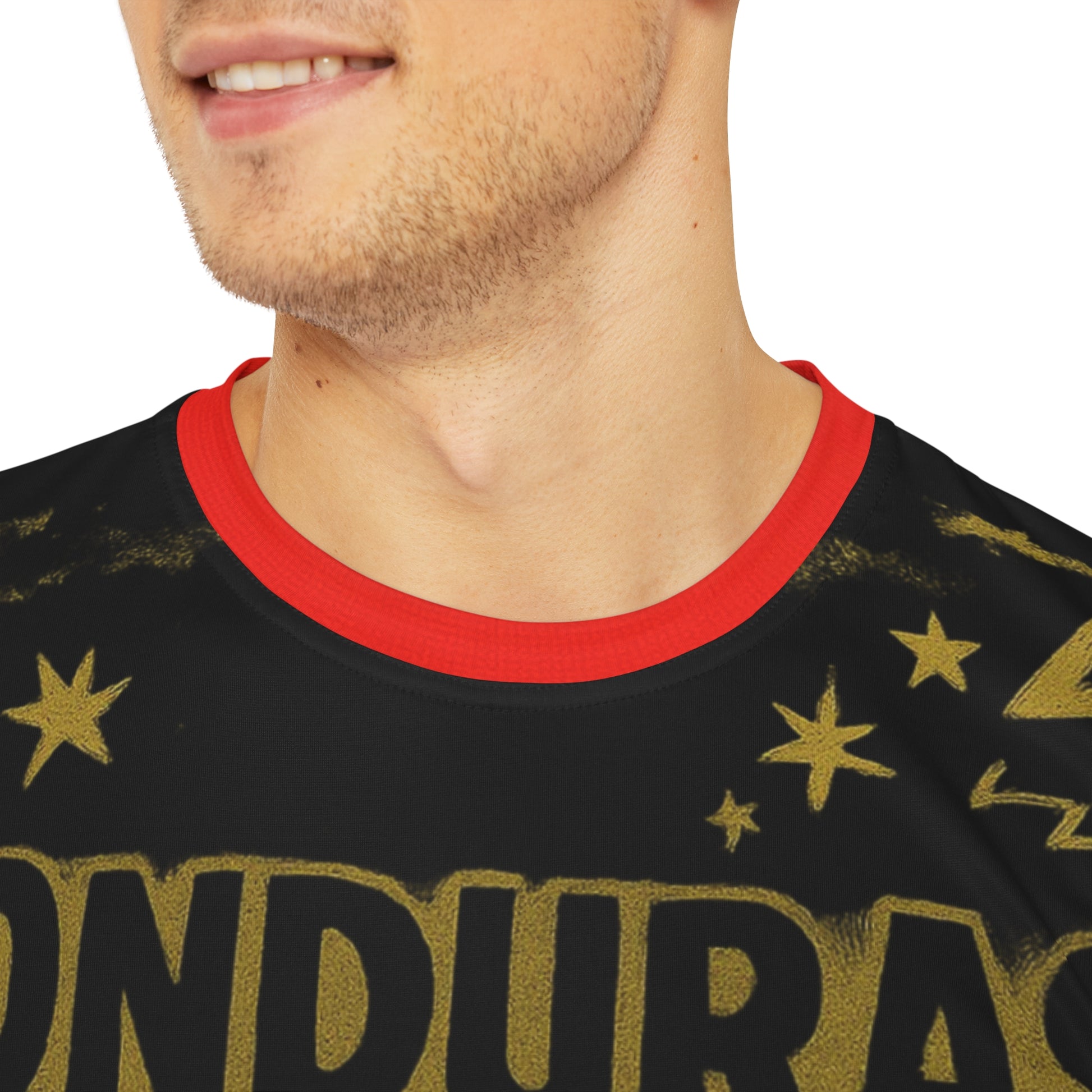 The Steel City Tee Honduras fuses raw edge street energy with Pittsburgh pride. Designed in bold black and gold, this shirt carries a gritty hand-drawn warrior graphic front and center, surrounded by lightning bolts, stars, and underground poster-style typography. The oversized print bleeds with attitude, while the addition of a striking red collar sets the piece off with a rebellious pop of contrast, nodding to football terrace culture and underground punk aesthetics.