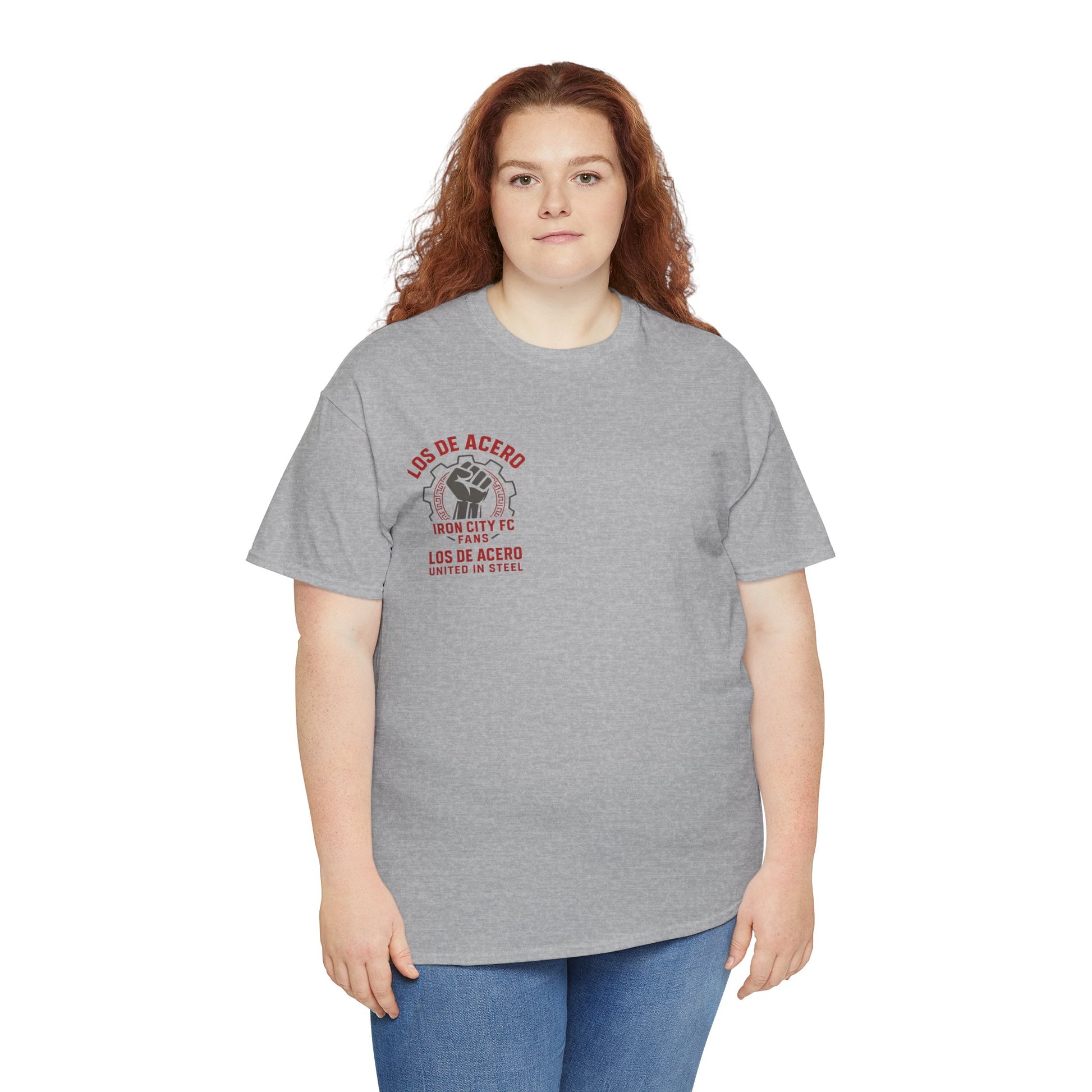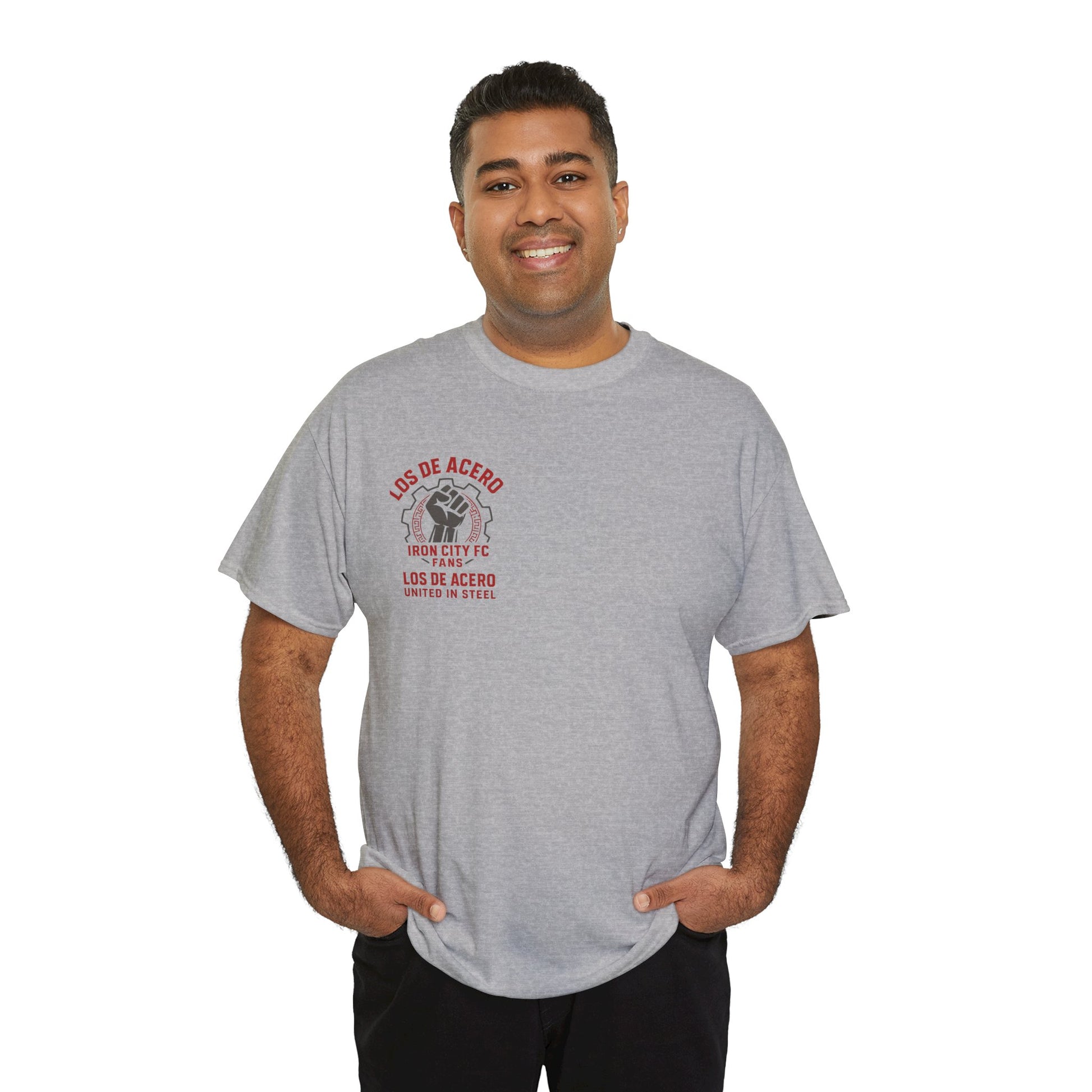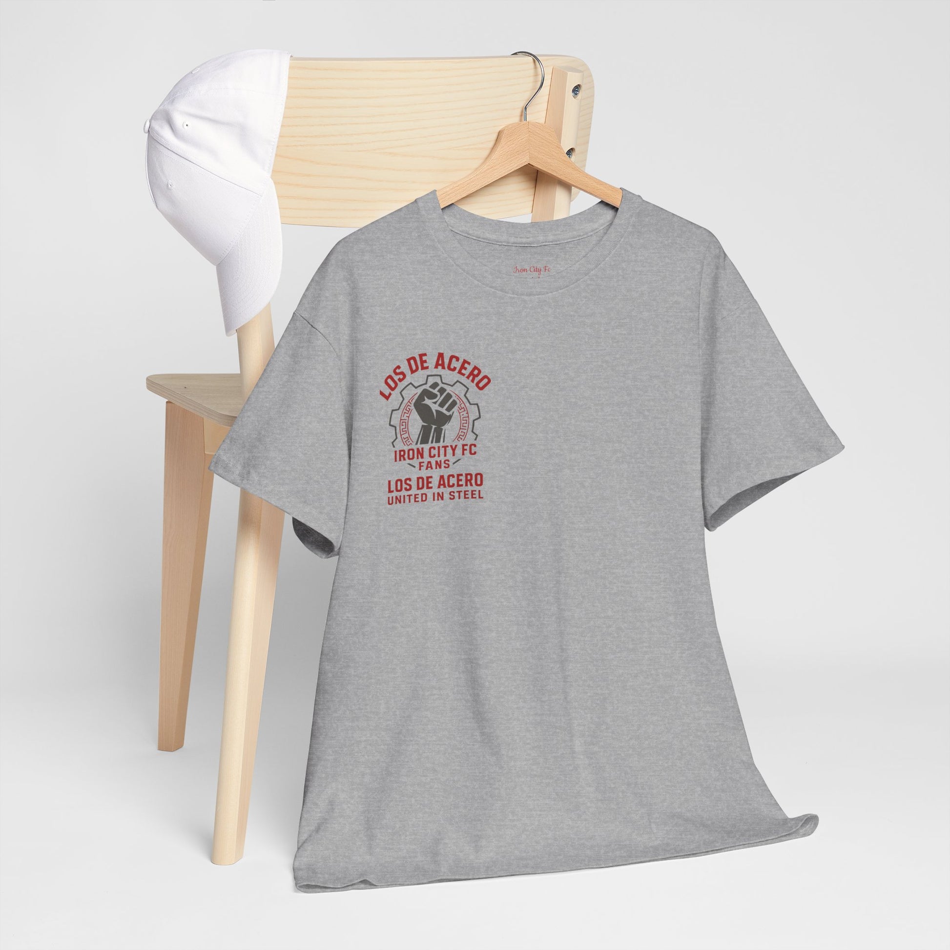 A unisex heavy cotton tee featuring the design 'Los de acero, united in steel'. This tee offers a comfy, relaxed fit with a timeless crew neckline for everyday wear. Perfect for adults looking for a sustainable and highly durable tee to add to their wardrobe. Relevant for various celebrations and casual occasions.